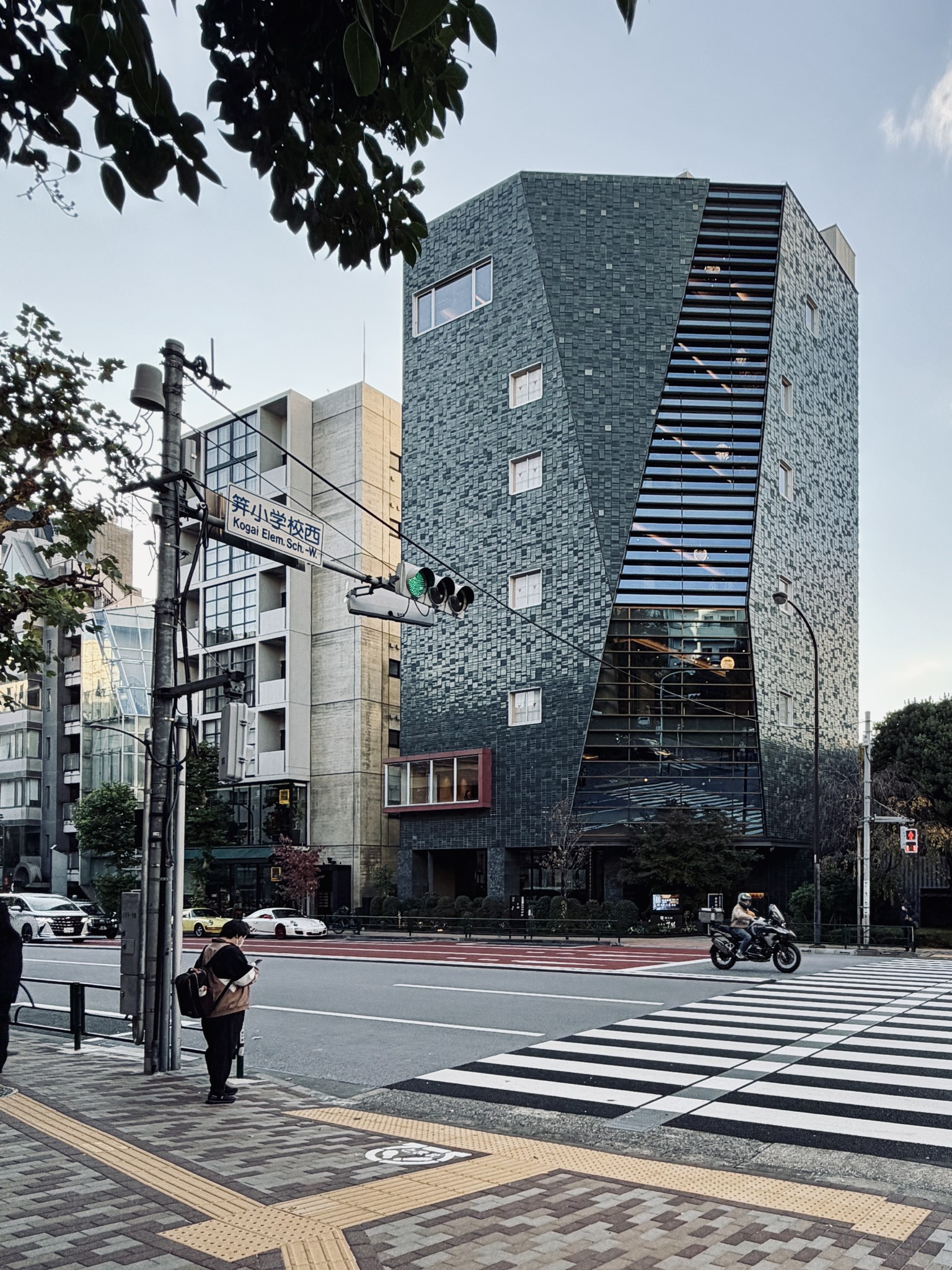 都内屈指の住宅街である広尾の、大通り沿いの交差点に建つビルは、合掌の形をモチーフにしたプロポーションで、外壁のタイルが夕日に照らされて輝いていたのが印象的でした。
