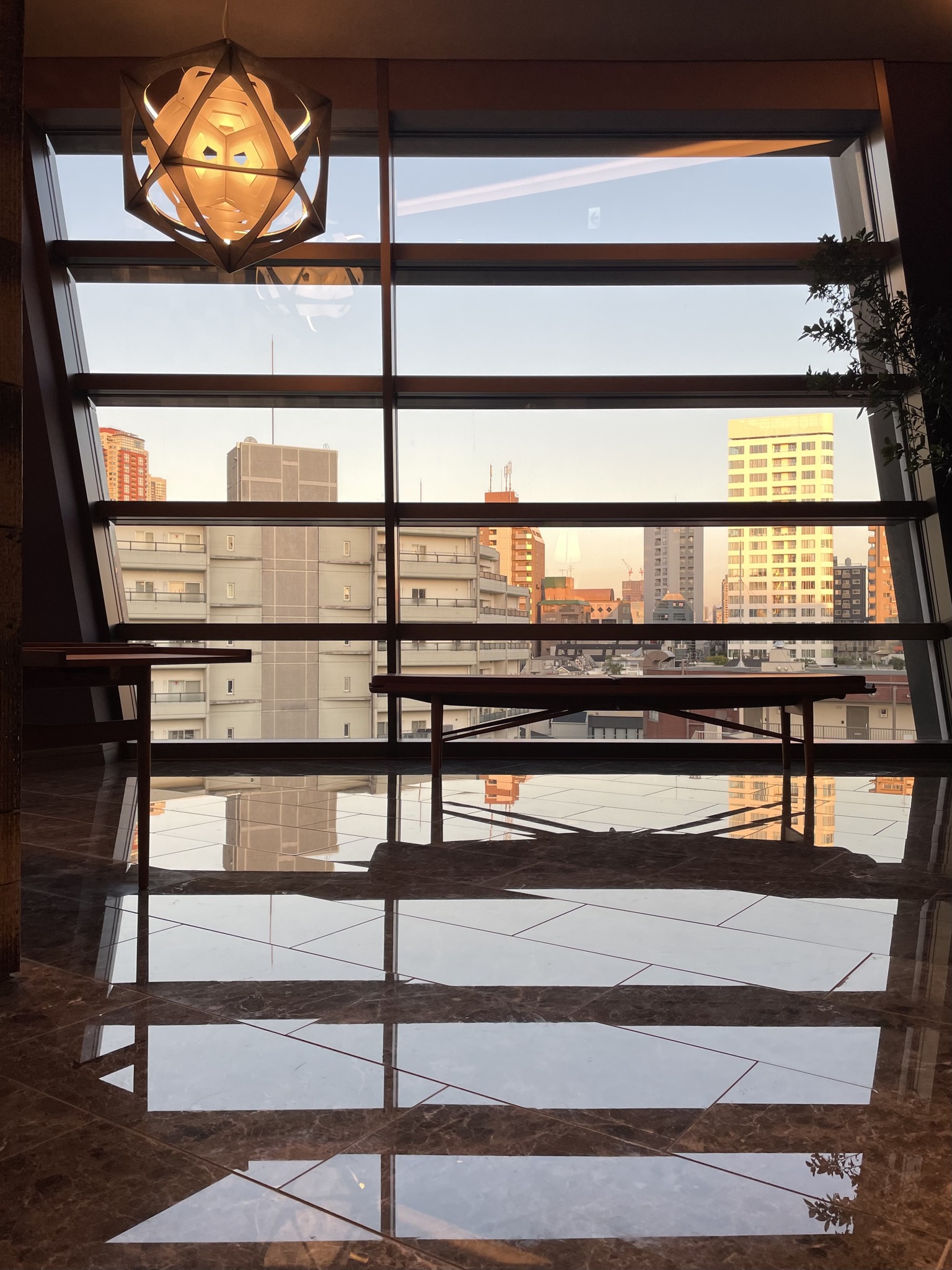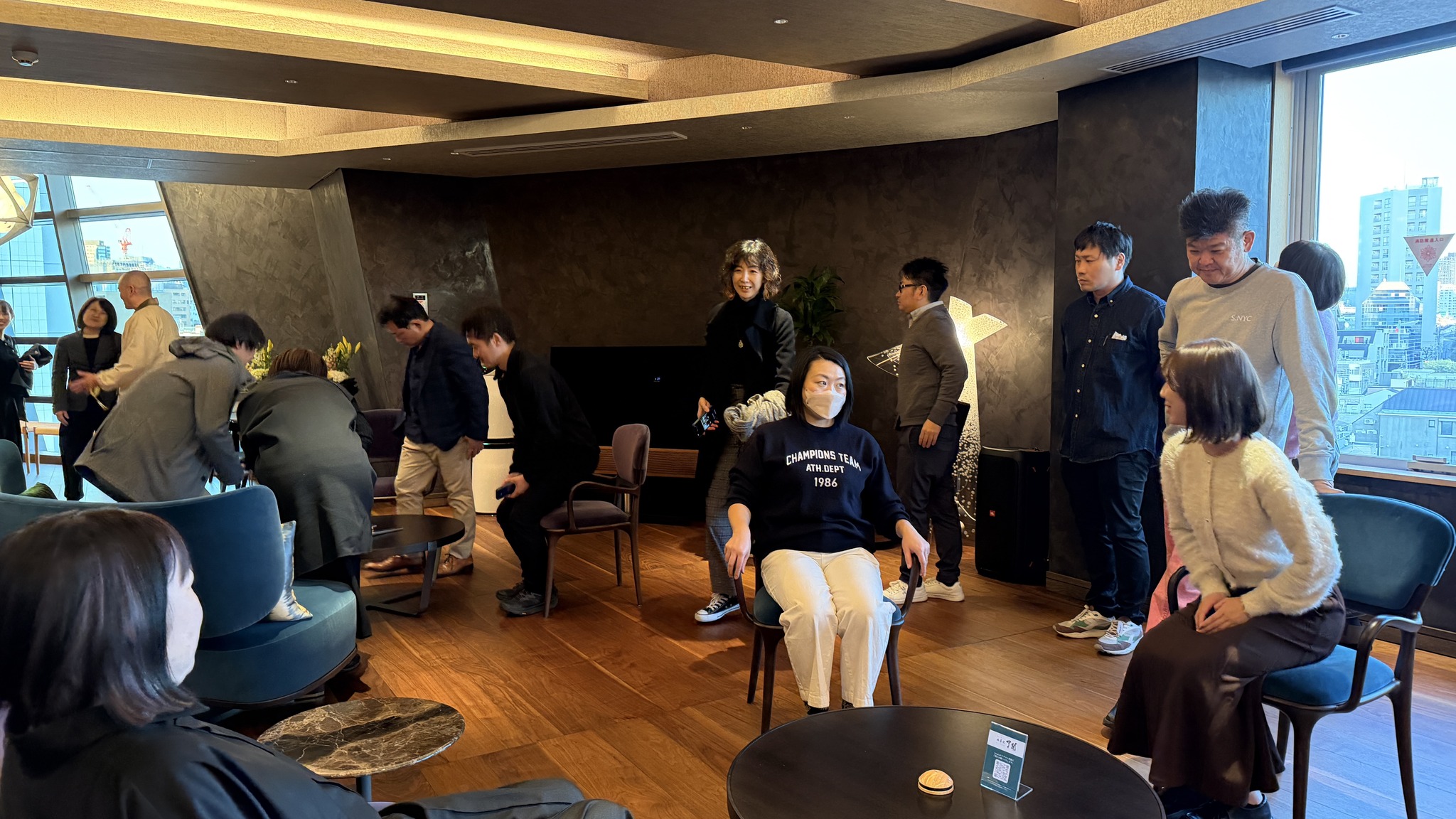 法事などの限られた時だけではなく、日常の延長で親しまれる場所にしたい、という想いから計画された室内は、納骨堂の一般的なイメージとは異なるもので、時間に応じて色づく街の景色を眺めながら、一級品の家具や内装材に彩られた空間で、知人友人ご家族が故人との時間を共に楽しめるような場所になっておりました。それを体感すべく、参加者も椅子や畳に座して話をしながら懇親を深めます。